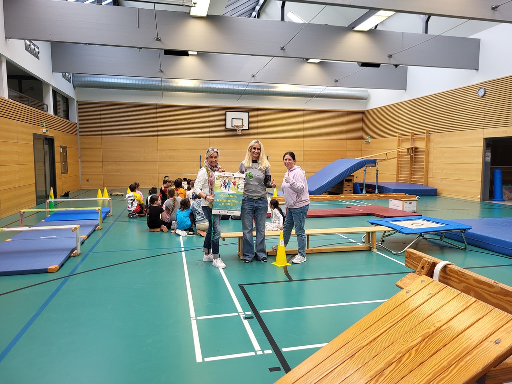 Für die Pater-Wald-Schülerinnen und Schüler stand daher am 02. Oktober 2025 eine besondere Sportstunde auf dem Programm. Leider spielte in diesem Jahr das Wetter nicht mit, sodass der Schulhof nicht für das Sportprogramm genutzt werden konnte. Daher teilten sich die Schülerinnen und Schüler in zwei jahrgangsübergreifende Gruppen auf, um den von den Sportlehrerinnen Frau Ziegler und Frau Barth vorbereiteten Bewegungsparcours in der Jakob-Reif-Halle ausgiebig auszuprobieren. Ohne größeren Aufwand kamen schnell alle Kinder in Bewegung und die Freude daran, war nicht zu übersehen. Auch Bewegungsmanagerin Lydia Karbach schaute eigens vorbei, um sich davon ein Bild zu machen und lobte die Kinder für ihr sportliches Engagement.